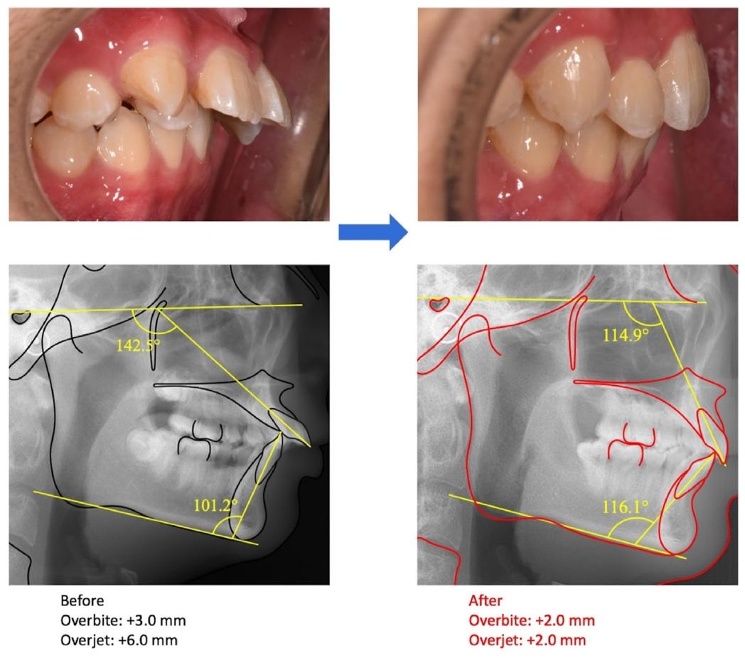 ✅ 头影测量:上切牙唇倾度显著改善(U1-FH角从142.5°→114.9°),下颌逆时针旋转,骨性关系更协调